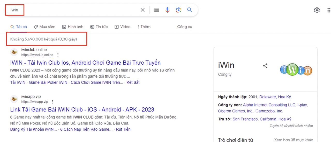 Chỉ có khoảng 150 nghìn kết quả tìm kiếm khi search Iwin688