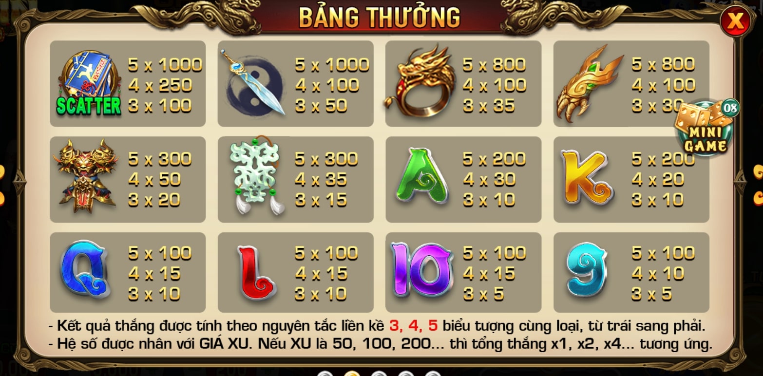 Slot Võ Lâm Truyền Kỳ là game slot có 243 cách thắng. Kết quả được tính theo các biểu tượng cùng loại liền kề từ trái qua phải.