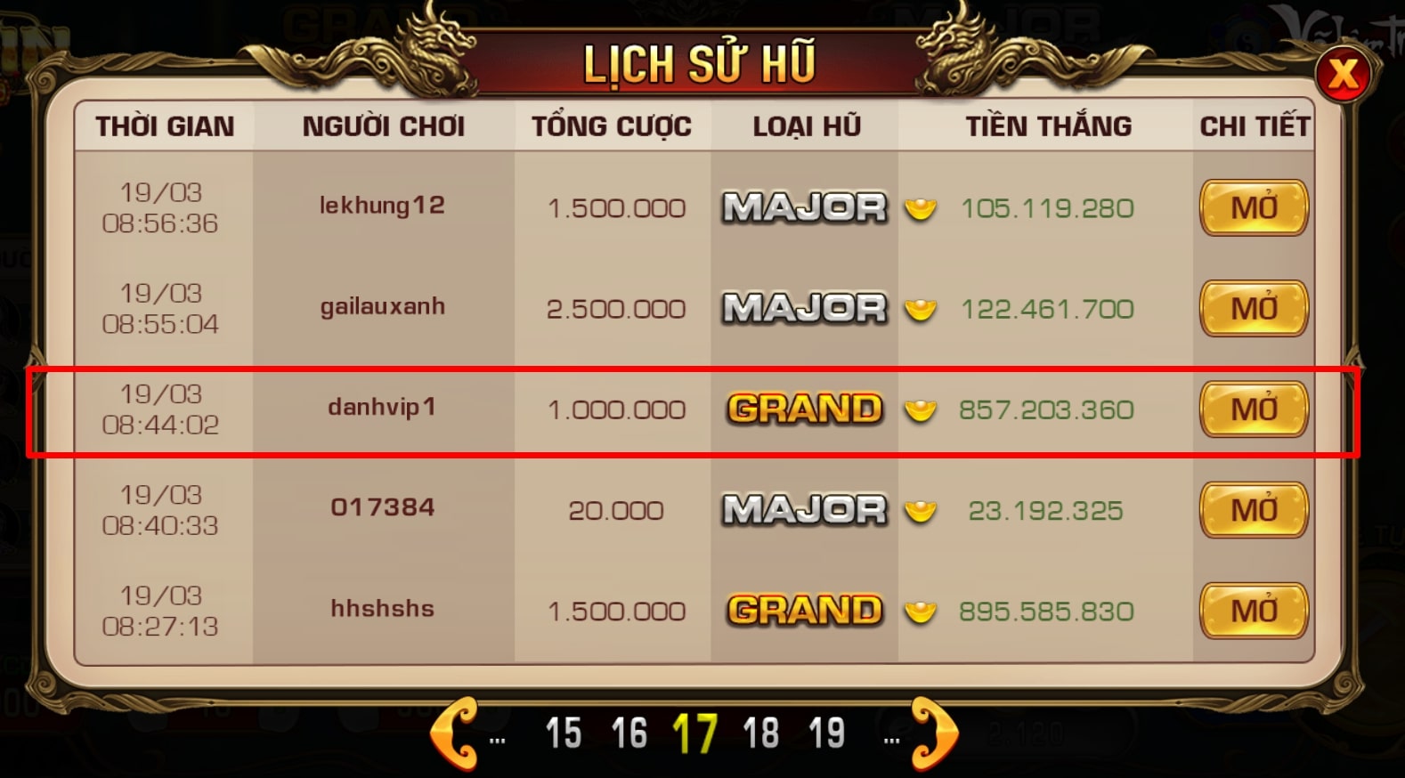 • Số lượng xu: 500 – Hũ Major: 100.000.000 – Hũ Grand: 1.000.000.000