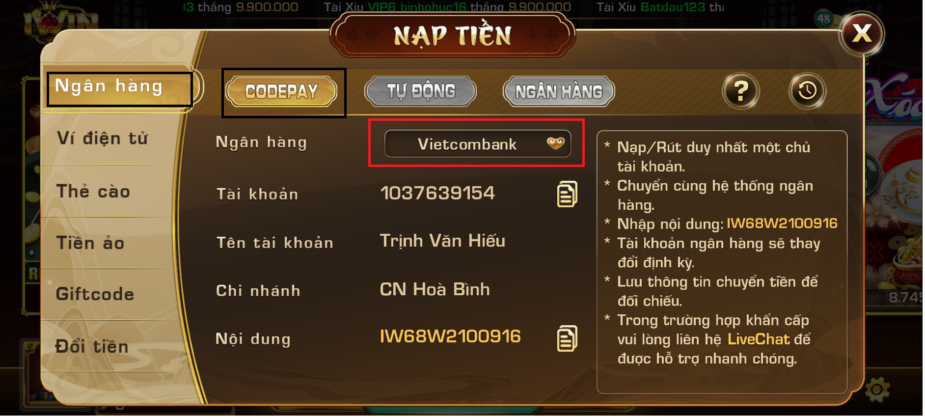 Hướng dẫn cách nạp tiền ngân hàng Vietcombank với iWin Club bằng hình thức Code Pay:
