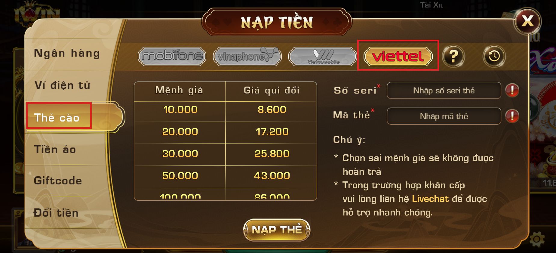 Bước 2: Anh em lựa chọn mục nạp tiền, lựa chọn phương thức nạp tiền là thông qua thẻ cào.